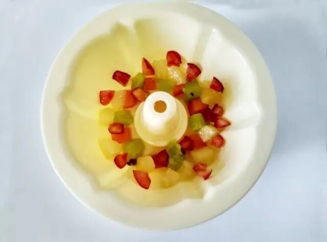 第五步:继续加入水果丁,然后倒入剩下的白凉粉水,再在顶部加入水果丁。