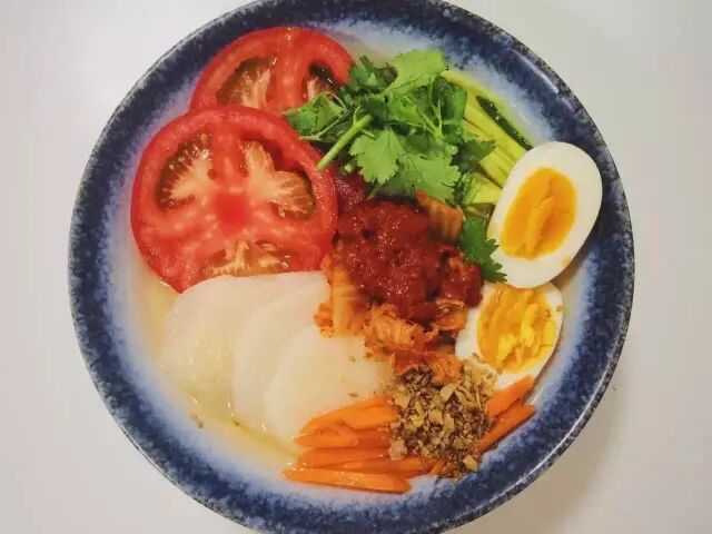 步骤2:选一只貌美的大碗,将沥干的冷面置于碗中,然后开始按照心意将配菜和酱料依次码好。配方多样:番茄、雪梨、酱牛肉切片、胡萝卜、黄瓜切丝、水煮蛋剖开,香菜切碎。也可以用青木瓜代替黄瓜、撒一些芝麻,滋味更棒。