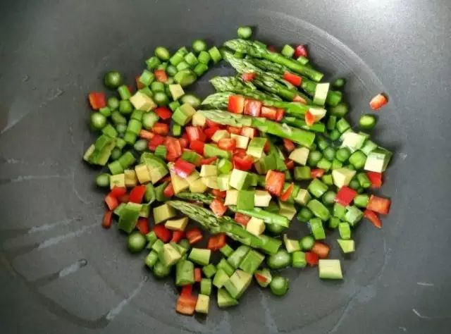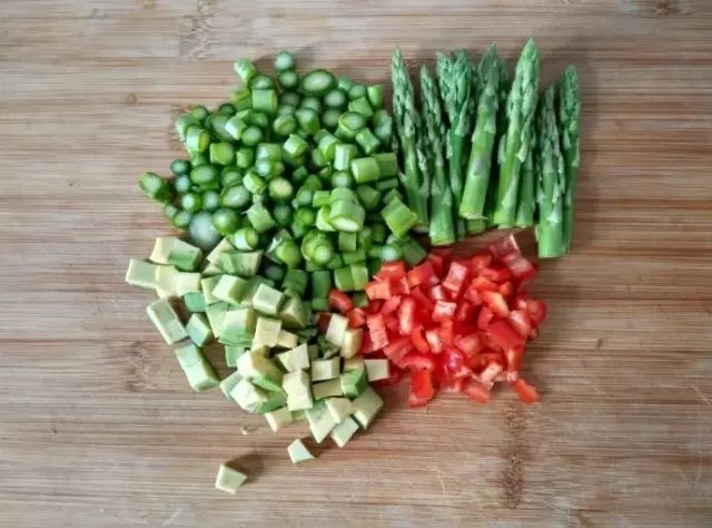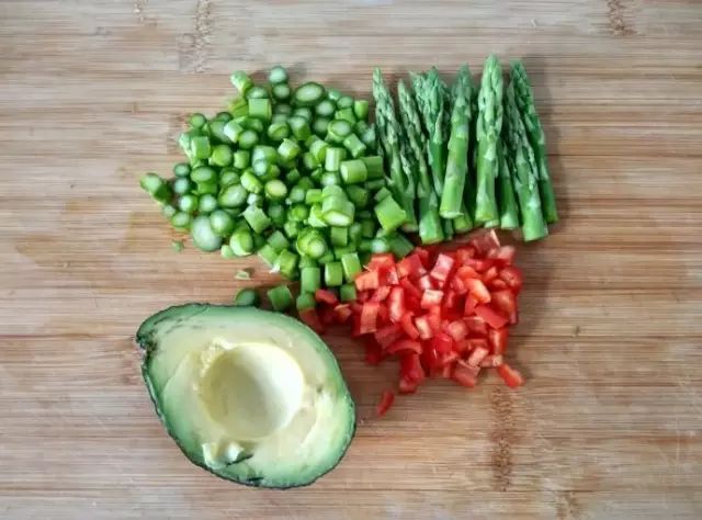第一步:芦笋洗净,将芦笋尖娇嫩部分切横段,茎部切成1厘米左右的小丁、红椒切丁、牛油果一破为二。