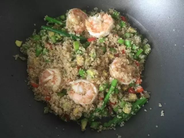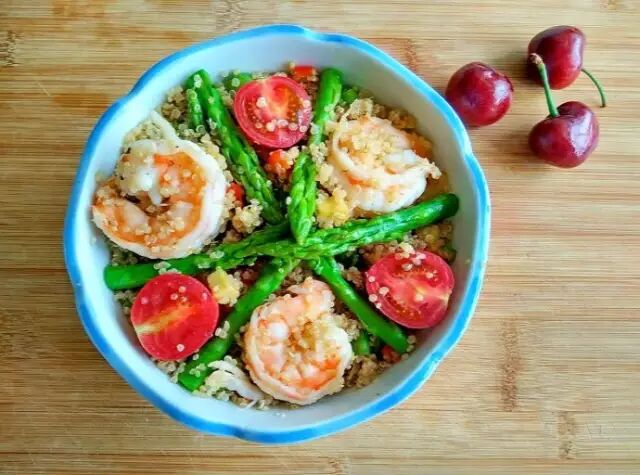 第七步:将炒好的藜麦炒饭盛入碗中,将几根芦笋尖错落有致地铺于藜麦炒饭上,再放上几粒切半的圣女果和炒好的虾仁,即可放心食用这道健康美食。颗颗绽开的藜麦看上去好像一粒粒小珍珠,还有朋友说像鱼子酱。