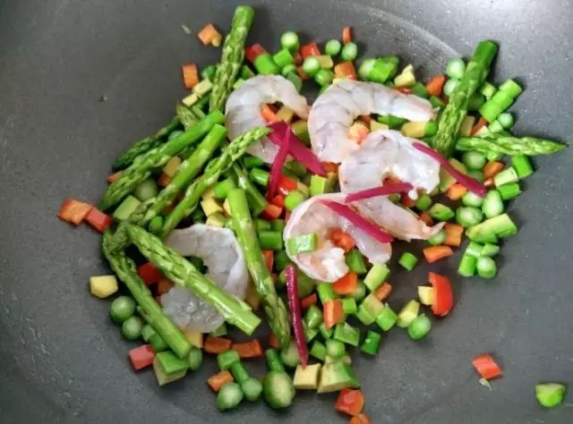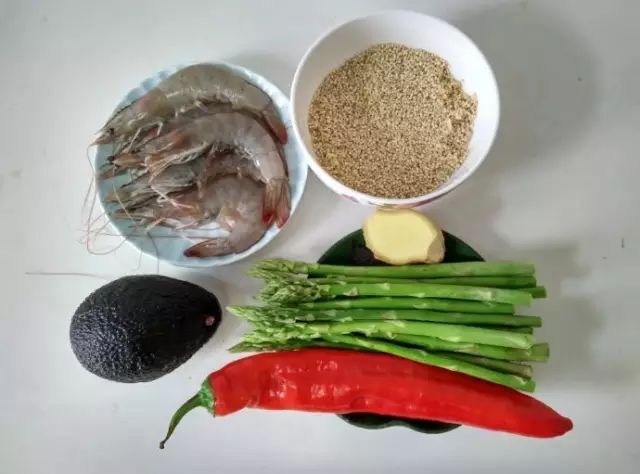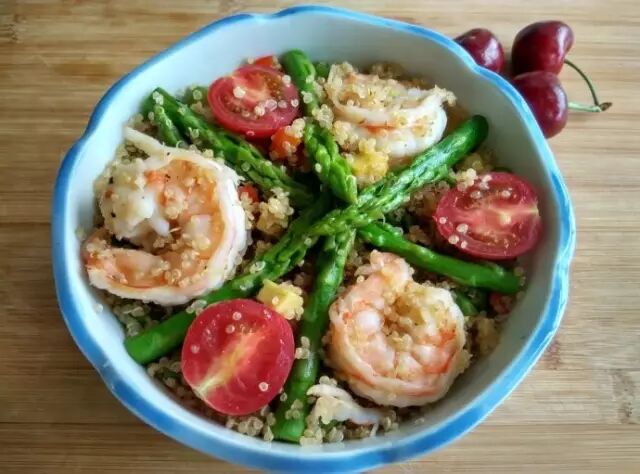 藜麦生重75克,牛油果半个约40克、芦笋100克,红尖椒半个30克、鲜虾150克、小圣女果3个。