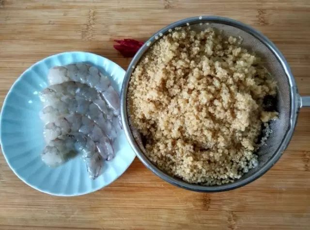 第三步:锅内加入少量水烧开,将浸泡30分钟的藜麦放入热水中煮15分钟左右。藜麦煮至开花,即露出圈圈尾巴即可。将鲜虾去壳,开背后去除虾线待用。