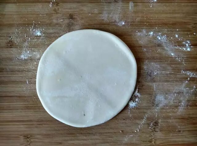 第六步、将擀扁的面饼继续来回擀上三十次左右,擀成一个薄薄圆形大面片。