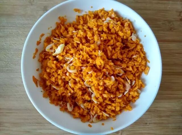 第二步、制作南瓜滋卷馅料,将南瓜切薄片后再切成小丁,再加入10克虾皮、8克香油拌匀。(注意此时南瓜馅不加盐)