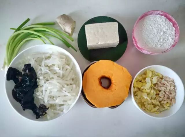 面粉500克,北豆腐半块230克、去皮南瓜一块318克、小葱一把37克、萝卜一段350克、水发黑木耳35克、炒鸡蛋两个130克、虾皮15克、生姜一小段、芝麻盐少许。