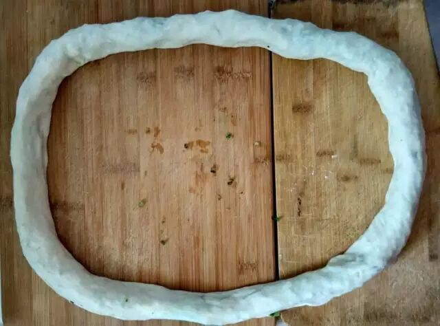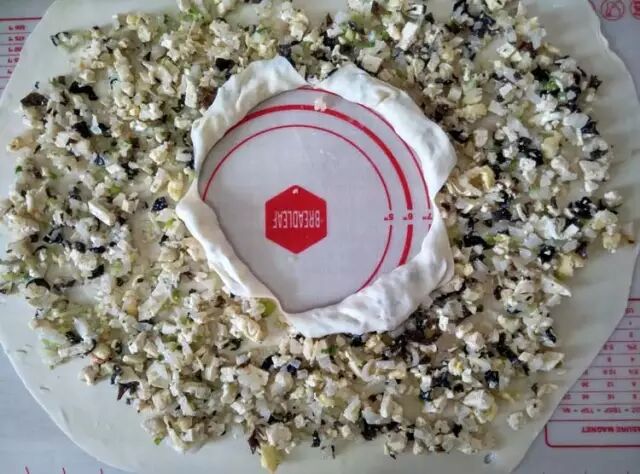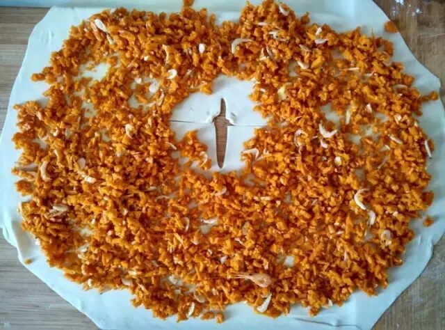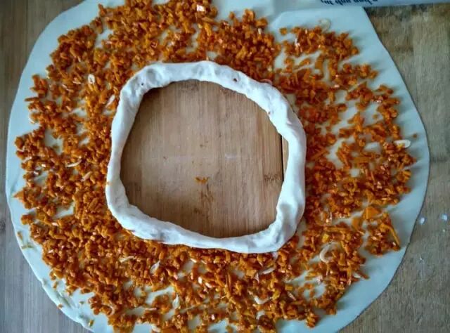第七步、在圆形大面片中部用刀划一个十字,在南瓜馅料里加入少许盐拌匀后,摊平在面片上,尽量抹平,摊均匀,留最外沿2公分不放馅料。(后加盐是为了避免南瓜过多出水)同样方法制作另一个萝卜豆腐木耳鸡蛋馅料的面皮。