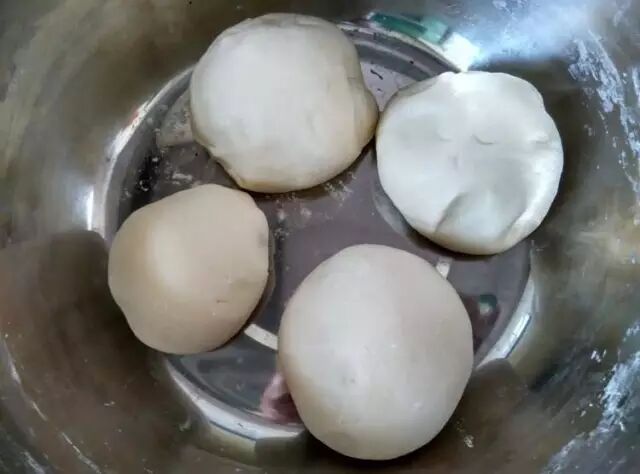 第四步、准备好馅料后,面团也醒发差不多了,将面团按揉光滑,分成四份,我的面团总共重量为900克,实际最后使用了三个大面团,还剩一个160克的小面团。