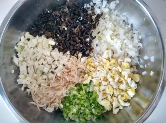 第三步、制作萝卜豆腐木耳滋卷馅料,将事先焯过水的萝卜丝切成小丁、再将小葱、木耳、豆腐切小丁、与炒好的鸡蛋、虾皮、8克香油、少许五香粉、芝麻盐一起搅拌成馅料。