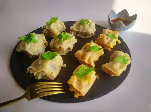 第十二步、准备一些香喷喷的辣椒油、少许蒜泥、适量醋、少许生抽,调成一个蘸汁,就可以配着美味又营养的双味滋卷,慢慢享用了,因为制作过程中我们已经预调了一些味道,所以原味的双色滋卷已经很美味,南瓜滋卷柔软清甜,萝卜豆腐鸡蛋滋卷清爽咸香,两种味道一次感受。