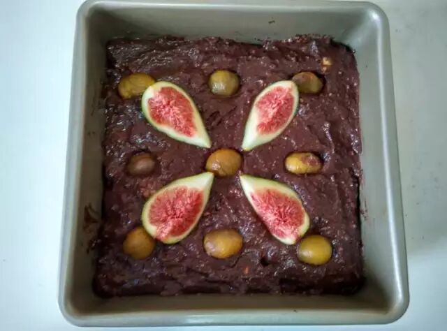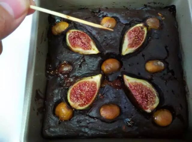 第十一步、用勺子背或者刮板将布朗尼蛋糕糊涂匀,放入栗子和无花果,在将模具在桌面上轻轻震荡,将蛋糕糊中的空气尽量振出。然后放入预热好的烤箱中180度烤35分钟。