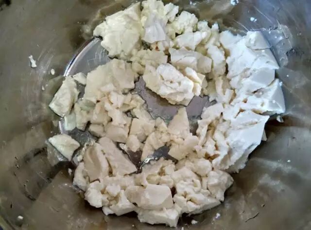 第二步、将嫩豆腐放入盆中用打蛋器搅拌成细腻的豆腐泥。可以先搅拌成块状再弄成糊状,稍微用点耐心就很容易搅成豆腐泥。