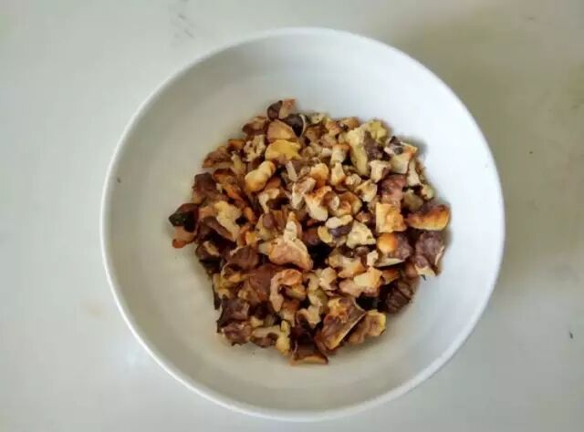 第一步、先将烤箱预热到180度,每个人家庭烤箱不一样,所以预热的时间也不同,将核桃仁放入烤箱中烤8-10分钟烤熟,将烤熟后的核桃放到一边放凉后摆成小块备用。