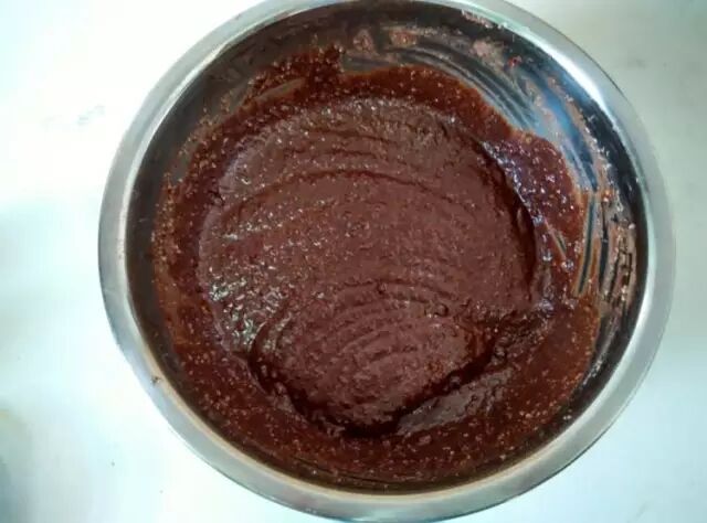 第七步、将可可粉与融化的黑巧克力液倒入混合牛奶豆腐蛋液糊中,翻拌均匀。(注意不要像打鸡蛋那种方法画圈搅拌哦)