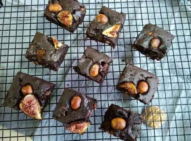 将布朗尼放到烤盘上凉凉,再切成小块就可以享用低脂低卡路里的黑麦全麦无花果核桃栗子布朗尼了,非常浓厚的黑巧克力的微苦,再加上核桃的坚果香和无花果被烤制后散发出来的焦糖香甜,还有秋季特有的栗子的甘甜。如果现在买不到无花果,那么就可以制作不适用无花果的版本,其他材料一样,不加无花果的版本依然很好吃。