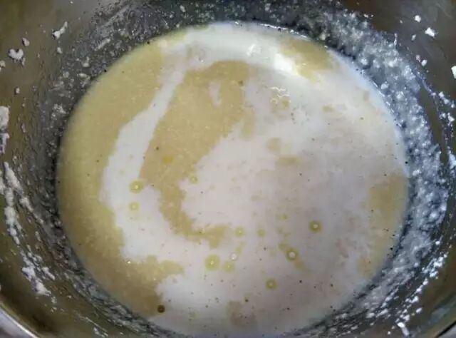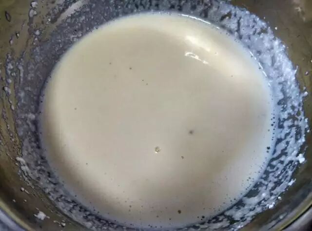 第五步、继续搅拌加入牛奶后的混合糊,直至变成图片中细腻湿润的半液态。