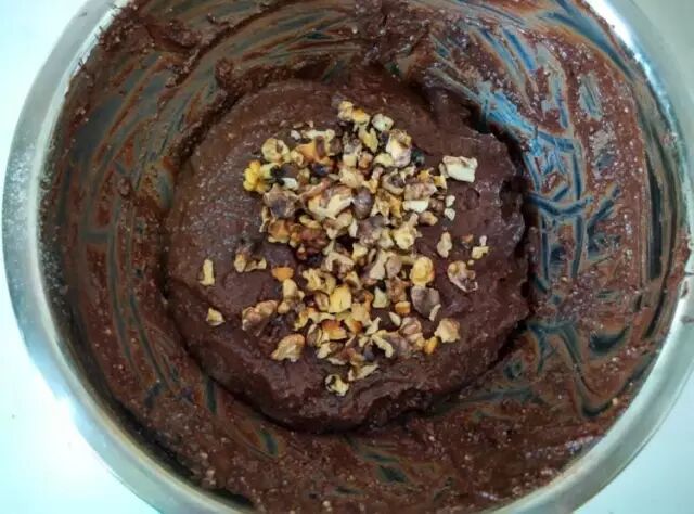 第九步、借助刮刀采用Z字形上下翻拌的手法,我家的刮刀找不到了,所以我急中生智用我家的米饭铲来完成这一步骤, 然后将提前烤过的核桃碎的2/3倒入巧克力黑麦全麦蛋奶面糊中,继续用翻拌的手法将核桃仁与面糊混合在一起。