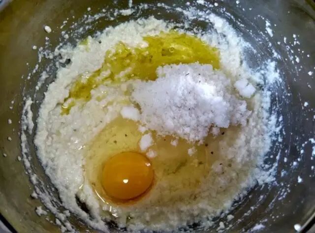 第三步、在豆腐泥糊中加入一个鸡蛋、细砂糖、橄榄油,搅成均匀的混合糊。