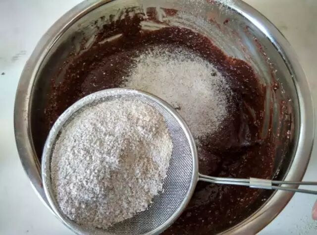 第八步、将混合好的全麦黑麦粉、泡打粉、咖啡粉、盐筛入巧克力牛奶豆腐蛋液糊中。