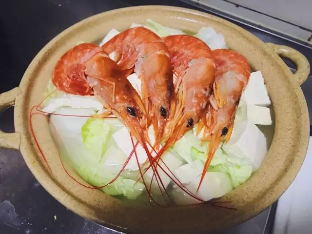 1、白菜半颗洗净切片,豆腐切块。虾洗净去虾线备用。