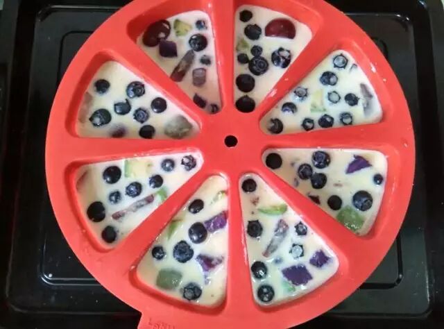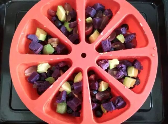第六步、取一个容器,用黄油在容器底部涂薄薄的一层便于烤好后脱模。我用的是硅胶模具,所以可以不涂抹黄油。在容器内平均放好蓝莓紫薯牛油果和提子丁。