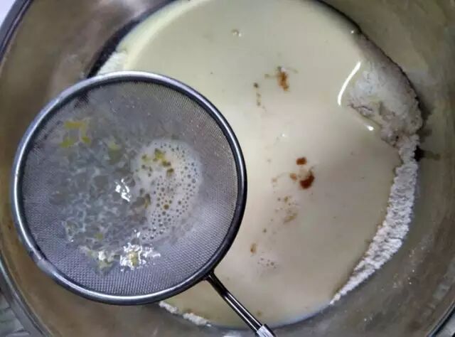 第三步、将蛋奶液过筛后加入第一步准备好的干性材料中,用打蛋器混合成蛋奶面糊。(过筛后的蛋奶液比较细滑,烤制成熟的布丁口感会比较细)