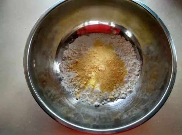 第一步、先将烤箱预热到180度, 同时将白面粉、玉米黄豆面粉、白砂糖等干性材料放入盆中,用打蛋器混合均匀。