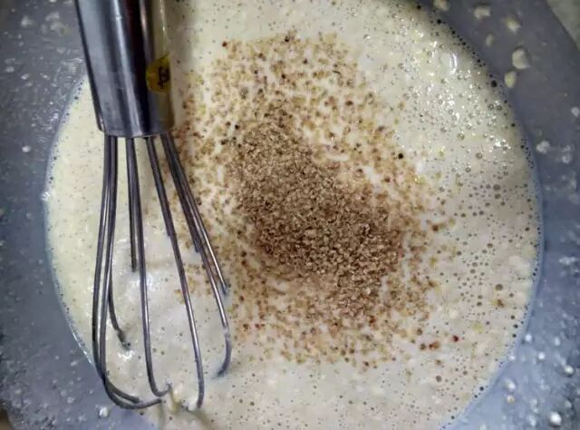 第四步、在混合糊中加入小麦胚芽,将所有材料搅拌成无颗粒的细腻面糊,比较像做松饼的面糊。