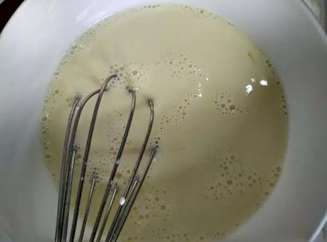 第二步、将鸡蛋三颗用打蛋器搅拌成蛋液,加入300毫升牛奶和10毫升香草精混合成蛋奶液。