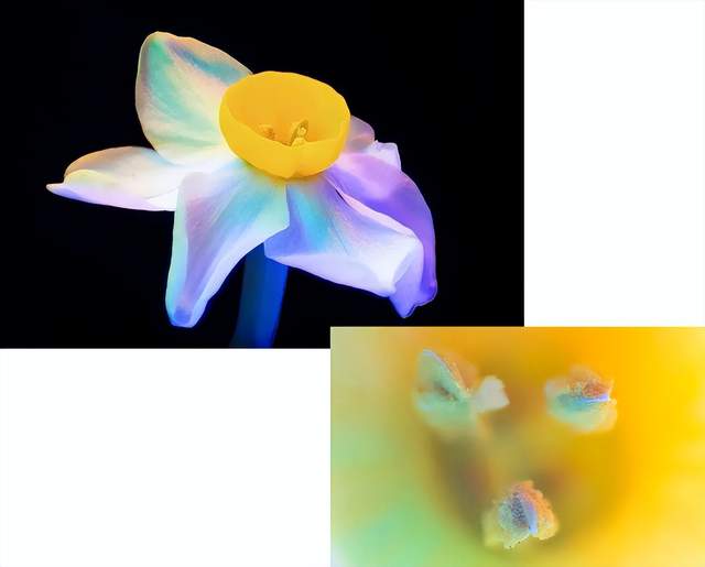 Semeniuta的系列作品《颗粒生物》中最强烈的标识是霓虹色,借助不同色的荧光溶液对花卉进行喷洒,在紫外线灯的照射下,呈现出了超越现实的视觉色系,得到了超越肉眼所能看到的奇幻色彩。