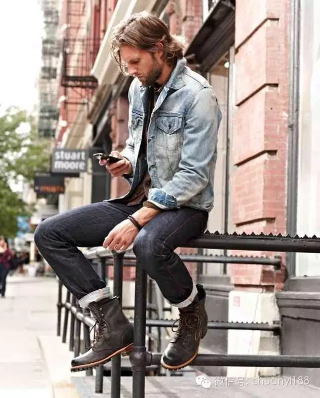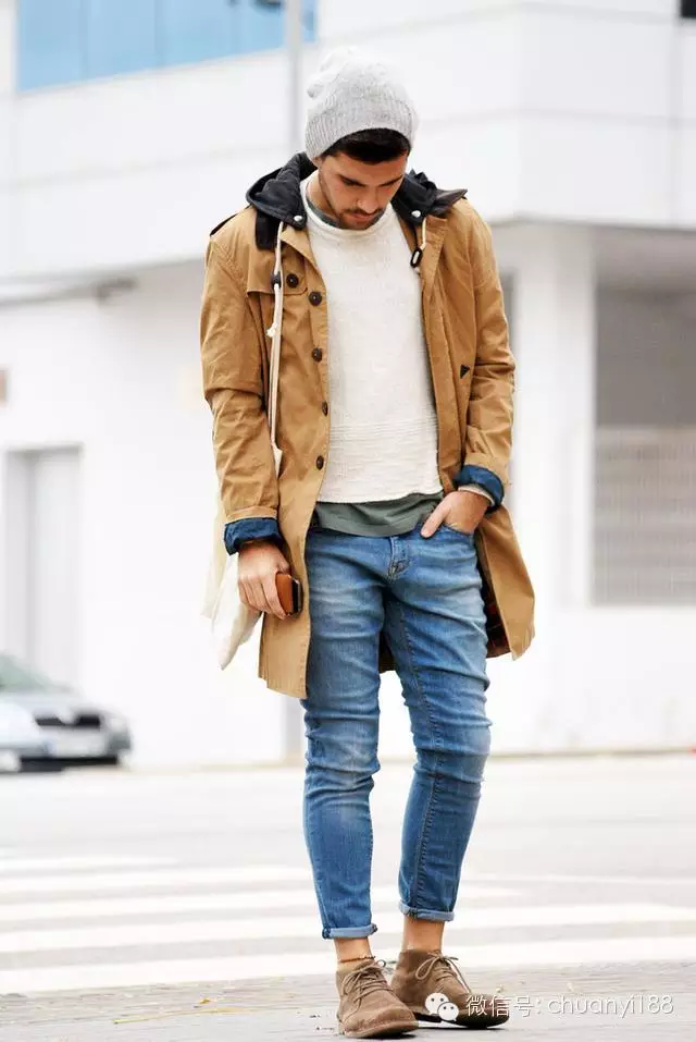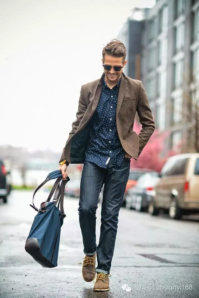 从这些街拍型男的照片中,我们不难看出,颜色偏深的牛仔裤,也多搭配深色的上衣和鞋子,这样保守的搭配,无论在何时何地都是不会出错的,如果你还想在一身有些暗淡的搭配上再有一些让人眼前一亮的感觉,那就需要在细节处多加用心啦!