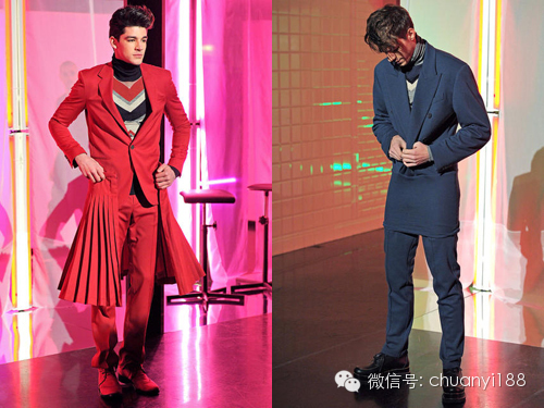 间的多种风貌,时尚老顽童Gaultier以几何图形高领毛衣混搭亮色西装,系列设计融入女性化元素的百褶裙、紧身裙等裙装混搭,前卫时髦的整体造型,无不让人耳目一新!