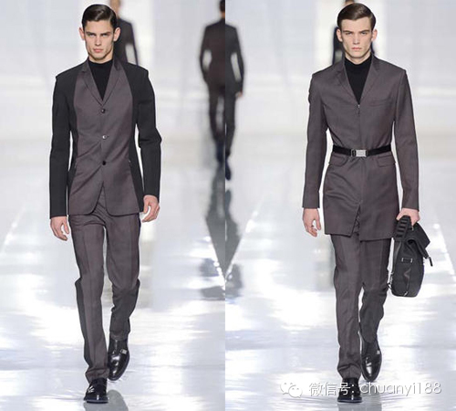 短领毛衣不仅能衬在衬衫里作为层次堆栈,Dior Homme巧妙运用短领的特点,将西装外套的领口位置拉高,简洁利落的男装轮廓,将男人衬得更加高大英挺,搭配梳整干净的西装头更增添模特儿精明干练的视觉印象。