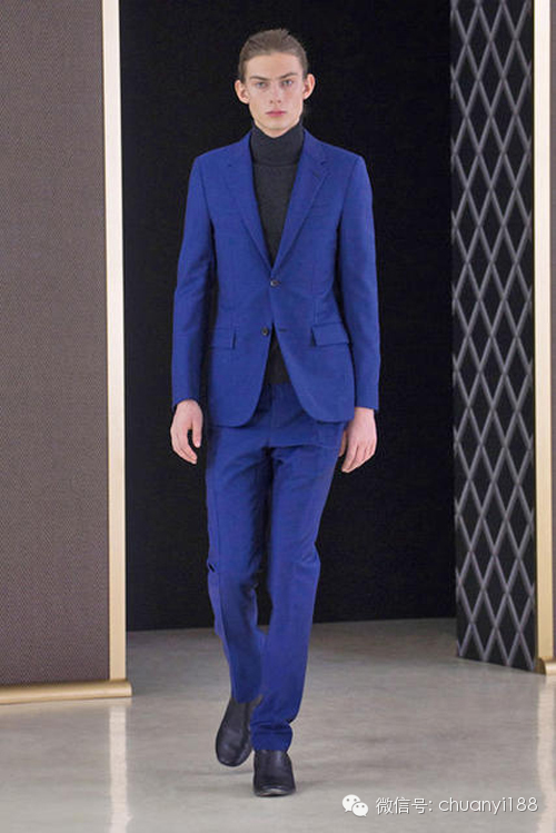 Balenciaga运用质感内敛的奇连蓝成套西装混搭高领黑毛衣,细腻优雅的颜色选择,简单穿出时尚吸睛的男装意象。