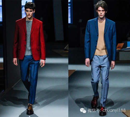 颜色可说是本季秋冬的不二重点,Prada运用色彩针织衫与西装外套撞色混搭,以皮革面料、光泽感Blazer与各色毛呢针织相互辉映,抢眼冲突的色彩搭配,碰撞出一系列令人玩味的秋冬色彩新视野。