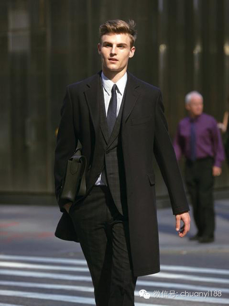 在阳光下若隐若现的经典黑色系的格纹背心与西装裤,搭上酷黑长版的风衣外套,手持手拿包,散发都会魅力的轻熟风味!