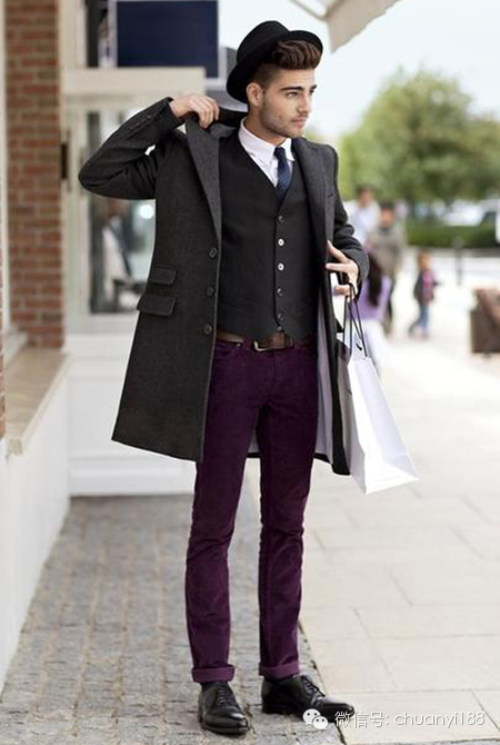 藉由保暖的绒布材质玩出优雅都会男风,首先梳高油头顶上绅士帽子,在珠光白色衬衫外罩上合身挺直的西装背心,运用咖啡色腰带凸显腰身,最后搭配紫罗兰色裤拉长腿部比例(展现9头身形),脚踩尖头鞋皮鞋,展现英伦绅士品味。