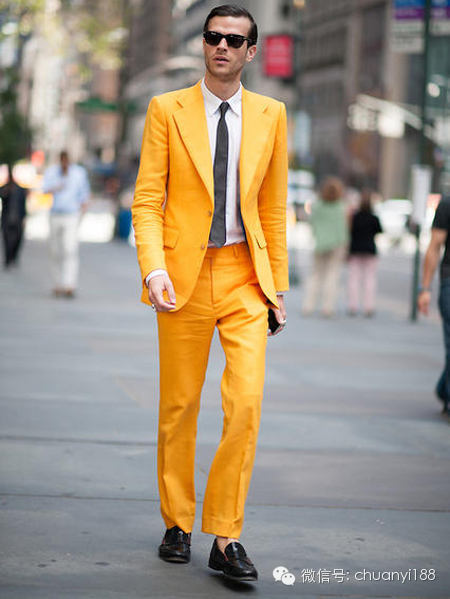 即便是朦胧的阴天,也能展现出“黄色小鸭调”的西装笔挺质感,其利落剪裁中,融入十足地光泽感、饱和度,搭配亮面皮鞋(不穿袜雅痞风)与墨镜,整体就是率性有型,令人难以招架!
