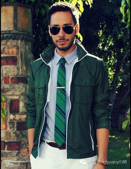 大自然绿色能利落表现出休闲惬意氛围,以蓝、白、绿等三色作整体变化,运用防水材质的墨绿外套(立领会更显帅气),上半身以水蓝衬衫搭上线条靓蓝、绿色领带,与白色裤子相衬,戴上复古雷朋眼镜,即便留点络腮胡,仍抢眼有型!