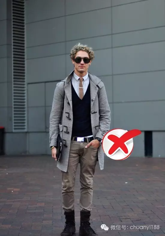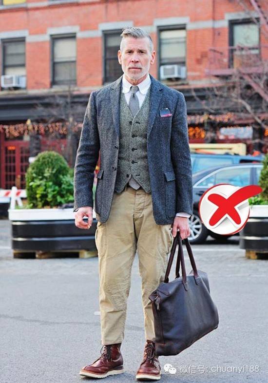 这次Nick Wooster大叔也一不小心上了黑榜,不修身反而宽松版的卡其裤是型男们一定得避开的雷区,如果上身选择的是短款上衣很容易暴露大象腿的事实,而且身材比例看的一清二楚,何不选择一条稍微长一些的上衣再换一条修身一些的卡其裤呢?