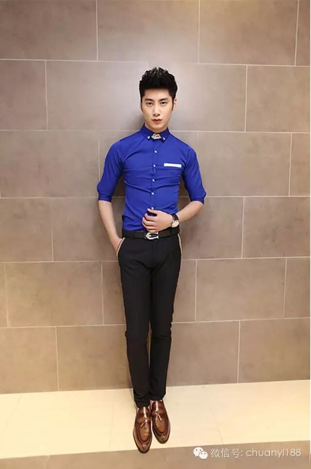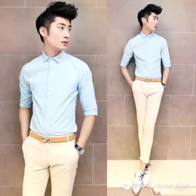 天蓝色衬衫+淡黄色长裤+白色皮鞋