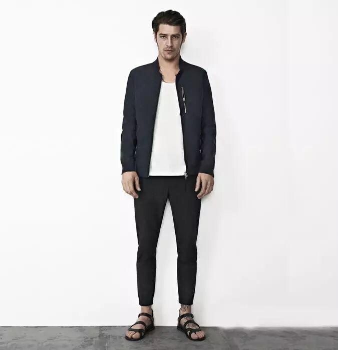 黑色皮革凉鞋线条简洁,能够很好的修饰腿型。搭配运动感十足的飞行员夹克,再配以白的T恤和黑色裤子,休闲又时尚。
