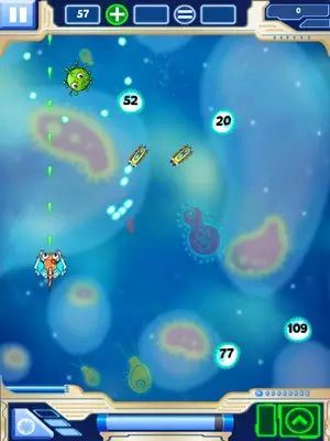 这款游戏是针对儿童学习四则运算的,对数学不好的成年人同样有效。游戏采用纵版射击的方式,你要躲避看起来像细菌怪兽的攻击,发射子弹干掉他们,同时要注意收集画面中出现的数字,如果收集的数字刚好完成一道四则运算,则能获得瞬间大杀器。