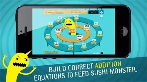 这款寿司怪兽的游戏着重练习的是孩子的加法和乘法,是由美国最大的教育出版社Scholastic出品的,在每一局游戏开始的时候都会先设定一个答案,厨师会把含有数字的寿司放在转盘上,玩家需要选择正确的组合得出答案获取寿司给怪兽过关。