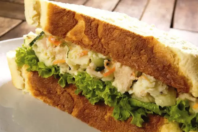 3、取1片全麦土司,抹上美乃滋,依序铺上材料D,盖上第2片土司,抹上美乃滋,放上香料鸡排,再盖上第3片土司便完成总汇三明治。