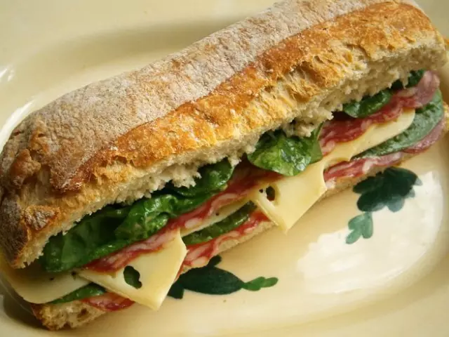 3、将生菜,西红柿片,鸡蛋片,火腿片,乳酪片加入法棍中,挤上一些蛋黄酱即可