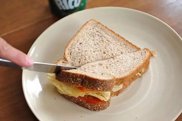 3、取两片面包,夹上煎好的鸡蛋和火腿、黄瓜片、乳酪片,从对角线切开, 即成营养美味的煎蛋三明治。