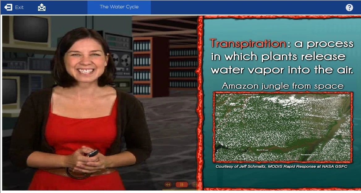 这里是初中课堂的水循环课程,讲述的是水蒸气的蒸发。那么在亚马逊丛林里,大多数时间气候都是炎热潮湿的,因此加剧了水循环的速度。通过这些特性可以推断出它处于赤道附近。