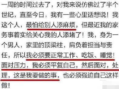 文章第一段,贾乃亮把自己最近一段时间的心境袒露了出来,虽然出了这么大的一件事,因为早已经定好的工作排程,还是不得不正常去平复自己,投入工作,同时站出来处理别人制造出来的事端。不得不说,亮哥真爷们,作为顶梁柱,努力工作还有担当,好父亲,好丈夫。