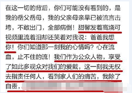 下面一段,贾乃亮关于家人病倒的描述,以及特别提到的甜馨的画面,非常直击人心,令人动容。随后一段话,却深深的写出了贾乃亮内心的痛苦心声,作为一个公共人物,正所谓“欲带皇冠,必承其重。”完全没有私生活可言,所有的东西都是放在聚光灯下,无论你愿不愿意,而且是被无限放大去被人议论,但是确不能做任何反抗、拒绝,因为是公共人物。这是一种荣耀,也是一种悲哀。