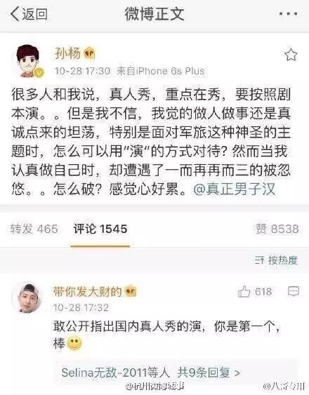 昨天下午,孙杨发布微博,称真人秀都靠“演“,自己认真做自己却一再被忽悠,并在文末艾特节目官微。随后,孙杨删除该微博。